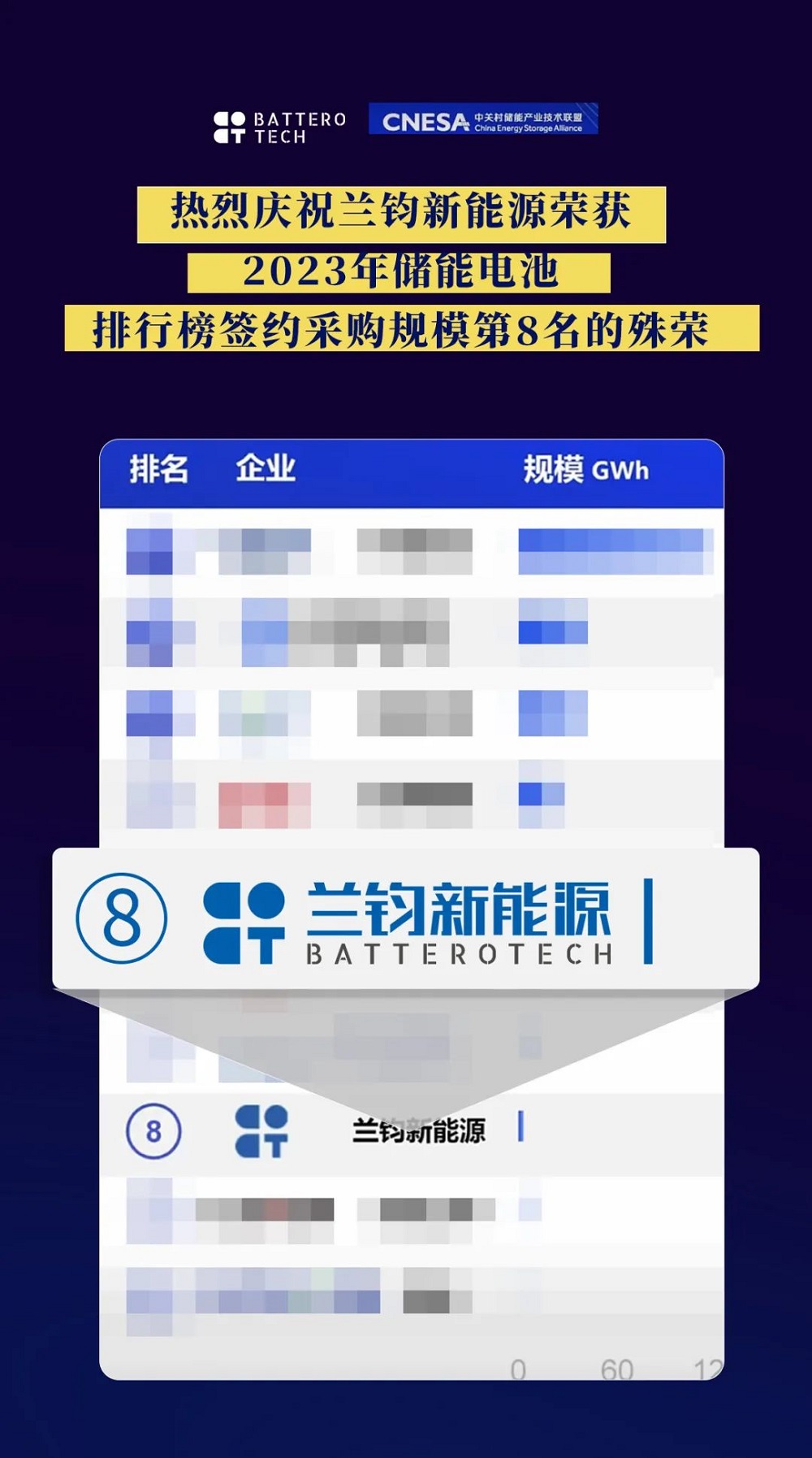 兰钧新能源荣获2023年储能电池排行榜签约采购规模第八名