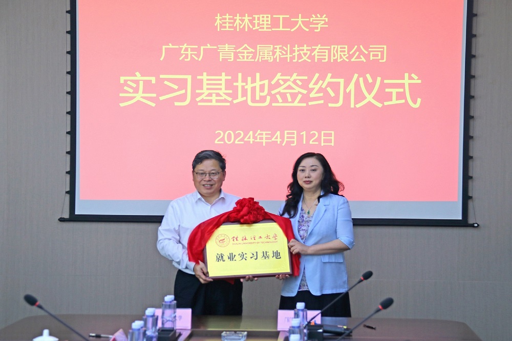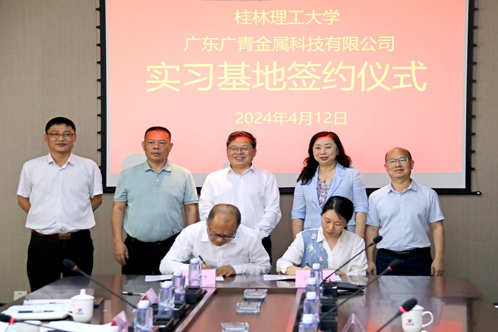 4月12日上午,广东广青金属科技有限公司与桂林理工大学举行校企合作签约暨就业实习基地授牌仪式,桂林理工大学党委副书记吴志强,阳江市人力资源和社会保障局党组成员、副局长梁妥记,广青科技党委副书记、工会主席王大庆等领导出席。