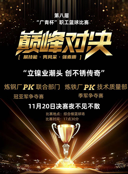 11月20日晚,第八届“广青杯”篮球比赛经过9天的紧张角逐圆满结束,广东广青金属科技有限公司300多名员工观看了冠亚军决赛。