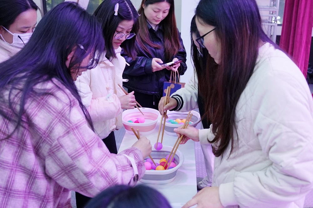 游戏互动区成为全场“人气王”。在“套大鹅”挑战中,彩色圆环划出优美弧线,精准命中目标引得阵阵欢呼;“蒙眼敲锣”环节,参赛者原地旋转后踉跄摸索,滑稽动作逗乐全场;“筷子夹球”“投壶争锋”“原地踏步挑战”等游戏则考验技巧与耐心,女员工们或屏息凝神、或默契协作,积分卡上的印章迅速累积。凭借游戏积分,参与者纷纷兑换保温杯、零食礼包等礼品,满载而归的不仅是奖品,更是节日的喜悦。