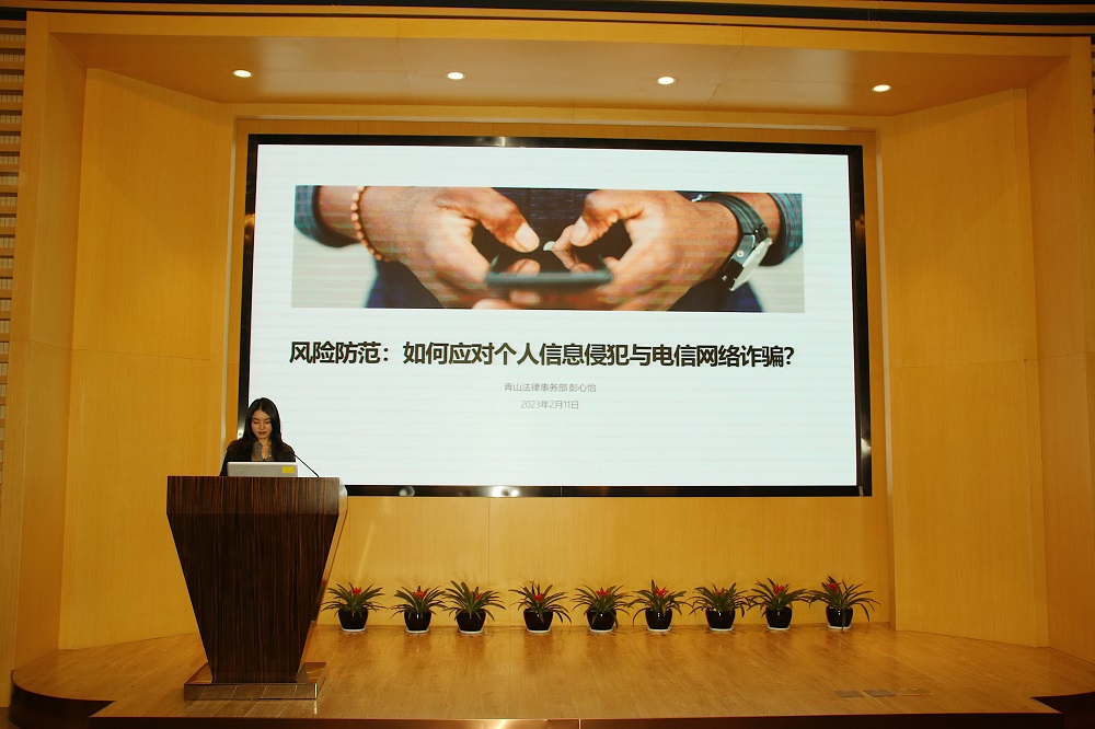 PA旗舰厅控股法律事务部法务专员彭心怡讲述了如何应对网络诈骗与个人信息侵犯等相关知识,她从一个个日常生活中的鲜活案例入手,剖析了各类因网络安全引起的典型事件,生动诠释了网络安全防范不足滋生的一系列问题、存在的安全威胁以及如何做好相关风险的预防措施,使得在场参会人员受益匪浅。
